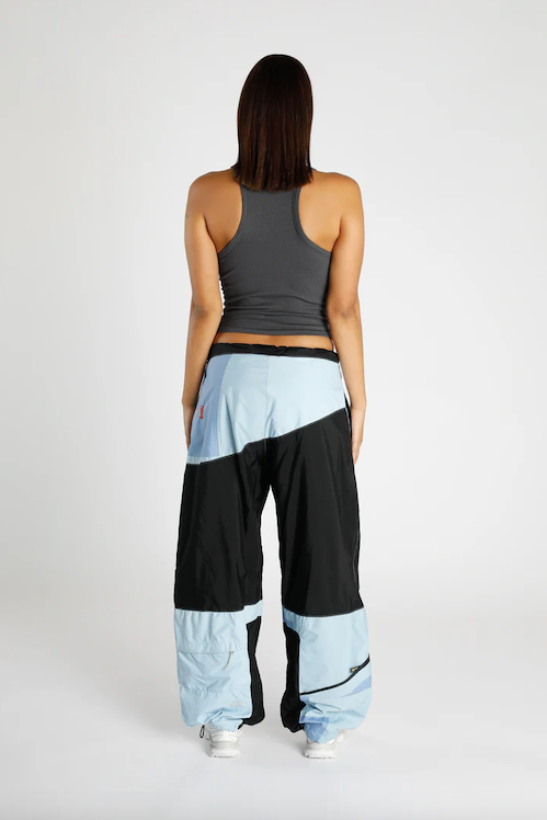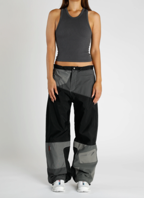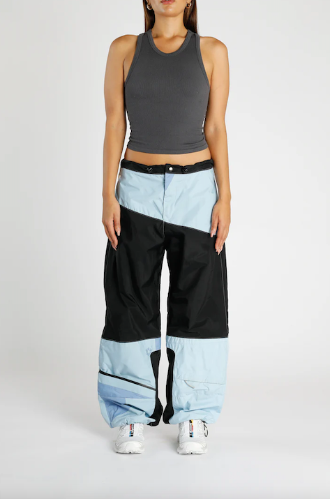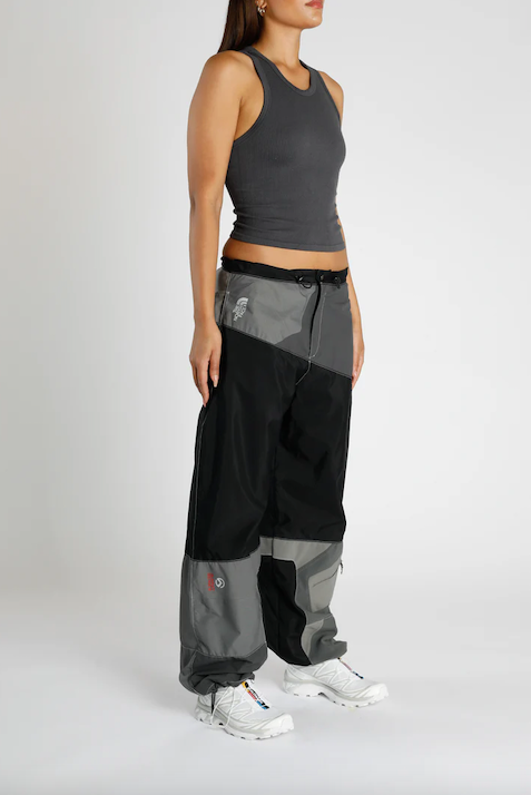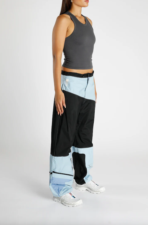 A pant re-worked from discarded North Face shell jackets designed to make use of products that could not be sold as vintage.